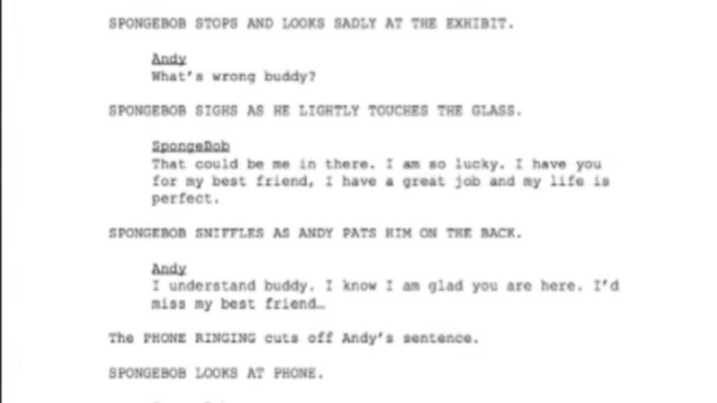 Mr. Orange explained his supposed John Hughes-inspired vision and the difficulties that came with bypassing the obvious copyright issues during an extensive phone interview with a YouTube channel called Ongoing Mysteries, which honestly boggles the mind with why he’d even bother making the thing without the proper licensing. Aside from the few materials in his possession, he made it clear that nothing from the film is accessible online (not including anything that might’ve been leaked, obviously), and that the first five pages of the script have been written. These pages were shown in Ongoing Mysteries’s video, and along with the plot synopsis on Amazon, it’s clear that the film was meant to tell the story of SpongeBob trying to revive his fading popularity by running a contest called “Spend a Day With SpongeBob”. A young boy named Seth wins the contest and joins the naïve fry cook on a hair-raising adventure, presumably when the contest leads to some unknown complications. Aside from the first couple scenes, none of the in-depth plot is known. Now that the search team has long since moved on and the websites for the film’s distributors and production company have been closed, the chances of A Day With SpongeBob being released or even made are near zero.