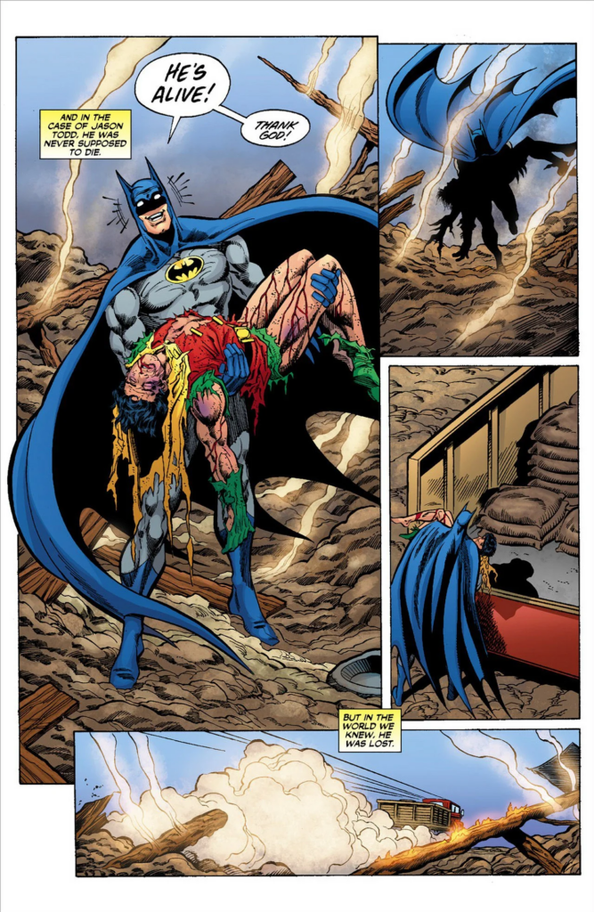 Thankfully, the one completed page was released with the hardcover remaster, complete with color. The only other noticeable difference is the added narration boxes, both of which self-reference the ending’s “what if?” nature, as well as the sad reality of what happened to the promising new Boy Wonder. I suppose the one silver lining of his death is that Batman would never endanger another budding sidekick or surrogate son again… unless they’re either bisexual or artificially gestated by ancient terrorists, that is.
