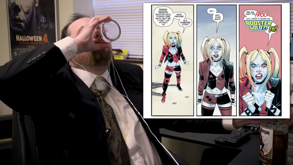 Ugh… you know, I’ve never been a fan of the idea of turning Harley and Ivy’s friendship into a straight-up romance, but because it had been brewing since the first season of The Animated Series, it at least feels earned to some degree. Now, I’m not presently up-to-date on the Rebirth timeline (whether that’s thanks to Joker War, Punchline, The Batman Who Laughs, Bruce Wayne’s clone, the inexplicable return of Thomas Wayne’s Flashpoint Batman, newcomers like Ghost-Maker that are solely dependent on neat physical designs, or Joker’s severed head in a jar becoming the next Robin, I have no fucking idea), but I am aware of a blossoming and considerably less socially progressive romance between her and… Booster Gold. Yes, the pathetic, entitled jock of the Justice League who may as well have originated as an unused character from The Boys. I’ve seen a few pages of that… and that’s all I’m going to bother with for my own mental wellbeing. Seeing an unhinged, Brooklyn-accented Joker henchwoman literally pulled from a ’60s soap opera get inserted into a sappy tween romance, like an embarrassing private fanfiction that DC actually published… I’m not aiming to slam the authors of Rebirth when I say that it makes me physically squirm in my seat. It surpasses both cringe and second-hand embarrassment in a way that simply cannot be understated.