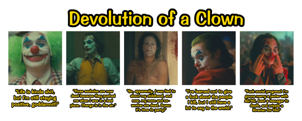 Sorry, Redditors, but it’s practically impossible to avoid comparisons between Heath Ledger’s Joker to Joaquin Phoenix’s. Just take the latter’s glamorous entrance onto The Murray Franklin Show versus the former’s into the corporate party, and the amount of charisma and energy that Phoenix expresses as he basks in the limelight instantly deflates the oblivious way that Ledger wobbles in like a drunken wino. Yes, the execution of the scene from the Nolan film was clearly intentional, but it’s totally at odds with what the character would actually do. Funny enough, a common issue people take with Joker is that it whittles a callous criminal mastermind down to an emotionally disturbed loner with an average or below-average IQ… despite the fact that it features him using a violent protest and a stolen usher’s uniform to sneak into a private theater screening. He later follows this up by using a protester’s clown mask and the ensuing brawl to escape the police, proving that he is in fact intelligent and capable of the character’s trademark escape artistry. Moreover, it’s true that Phoenix seems to use The Murray Franklin Show as a vessel to vent his frustrations, but the way I’ve always seen the film, his transformation into the Joker isn’t quite complete at that point. It’s after he (again, spoilers!) ends the show with a bang that he’s solely out for blood, completely devoid of anything else to prove to the world, and the “blood smile” scene at the end is basically his crowning moment as the Clown Prince of Crime, now that he’s surrounded by his loyal subjects.