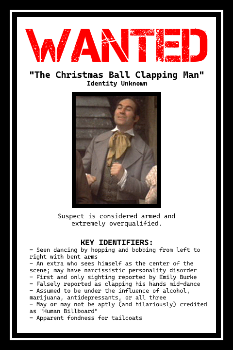 Then again, this is a tradition of my family’s we’re talking about, so our admiration for it does surround some of the more, uh… inexplicable details. See, the film has a frightening yet visually intriguing Hell sequence during the climax, where Scrooge meets Marley in a jagged red cave system of sizzling hot rock. He’s taken to his cell, which is an icy rendition of his office, and a team of sweaty red actors in balaclavas wrap a gigantic chain around him. Thus, Marley’s threat about the chain Scrooge had been building for himself through his sins pays off in a way it hasn’t in other adaptations, due to no sequence like this existing in any of them. The odd part? I was always familiar with it throughout my life, but seeing as my parents first saw the movie as children, they only saw this scene once in theaters before it was cut from every subsequent screening. Presumably, it was only added back when the film was released on home media decades later, so, yeah… looks like this film’s comparable to the ’64 and ’65 versions of Rudolph, where certain scenes were cut for decades until home media restored them. You can read about that broadcast oddity on my beta content post here due to YouTuber Lane’s video on the subject having been blocked for copyright reasons because YouTube’s a fucking cesspit, hence why I turned to blogging. In fact, if you think that’s the only urban legend my family’s invented around this very specific TV movie, think again, as there’s an extra during the Fezziwig ball flashback who, while his identity is still unknown to this day, we refer to him as the “Clapping Man”. And, of course, by “we”, I mean “mostly just Em”. Some Christmases ago, while we were watching the movie, Em reminded us of a character she remembered from her youth in the ’90s, claiming he cannot be unseen once you notice him. Sure enough, next to young Scrooge during the “December the 25th” musical number, a very upbeat party guest in a yellow tie and tailcoat just sorta bobs around playfully despite not even coming close to being the intended focus of the shot, but there’s at least two in which he’s all too prominent due to being vastly overqualified for the part. If you’ve seen, met, or gone to high school with this chap, then please comment down below. A lot of very strange infidels are looking for him.