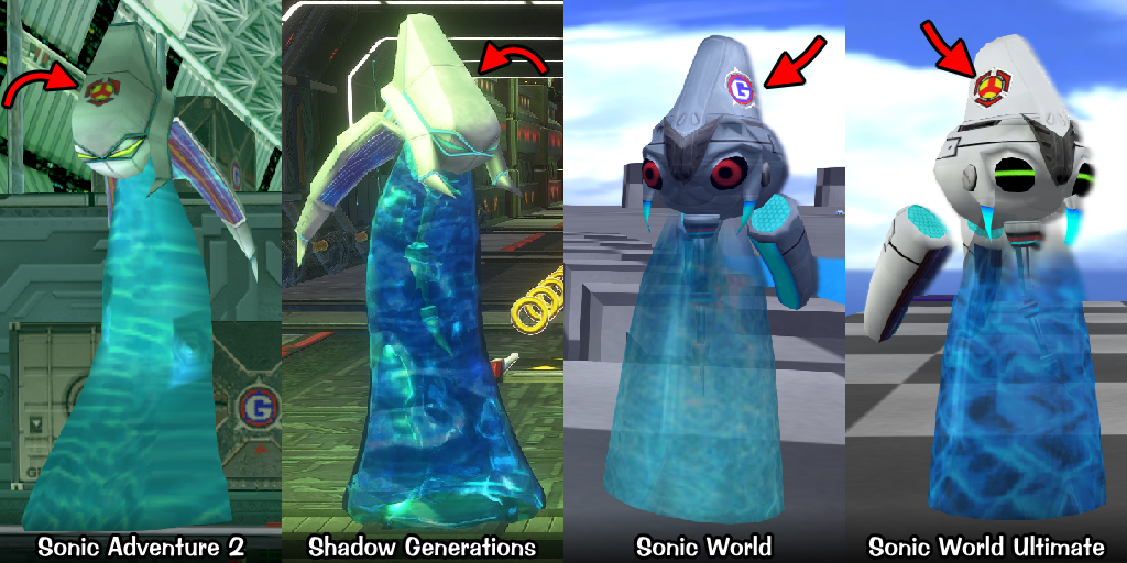 Yeah, no, that’s not why the Artificial Chaos were made. In Sonic Adventure 2, the only verbal info you got on them was Omochao calling them research projects, and that was the point—printed on their heads was the Project Shadow logo, so the subtle implication was that they were part of the research that would go on to birth Shadow as well as the Chaos Drives. In and of itself, the premise of discovering catastrophic floods that ended two advanced civilizations four thousand years apart and basing search-and-rescue units off the being responsible makes absolutely zero sense, but in a sneaky little move, the Project Shadow logos were removed from their heads for Shadow Generations. Nice try! Now, sure, the P-1 and P-100 variants of the same enemies are found in Sonic World with G.U.N. logos printed on their heads, but it can be assumed that they were later reprogrammed as G.U.N. units, and either way, I’ve replaced that texture with the classic Project Shadow logo for my overhaul. Plus, the lack of story keeps their initial purpose from being squandered (the gap left is filled by Marathon Mode), and the new models manage to compete with those seen in Shadow Generations, and not just as far as a fan game goes.