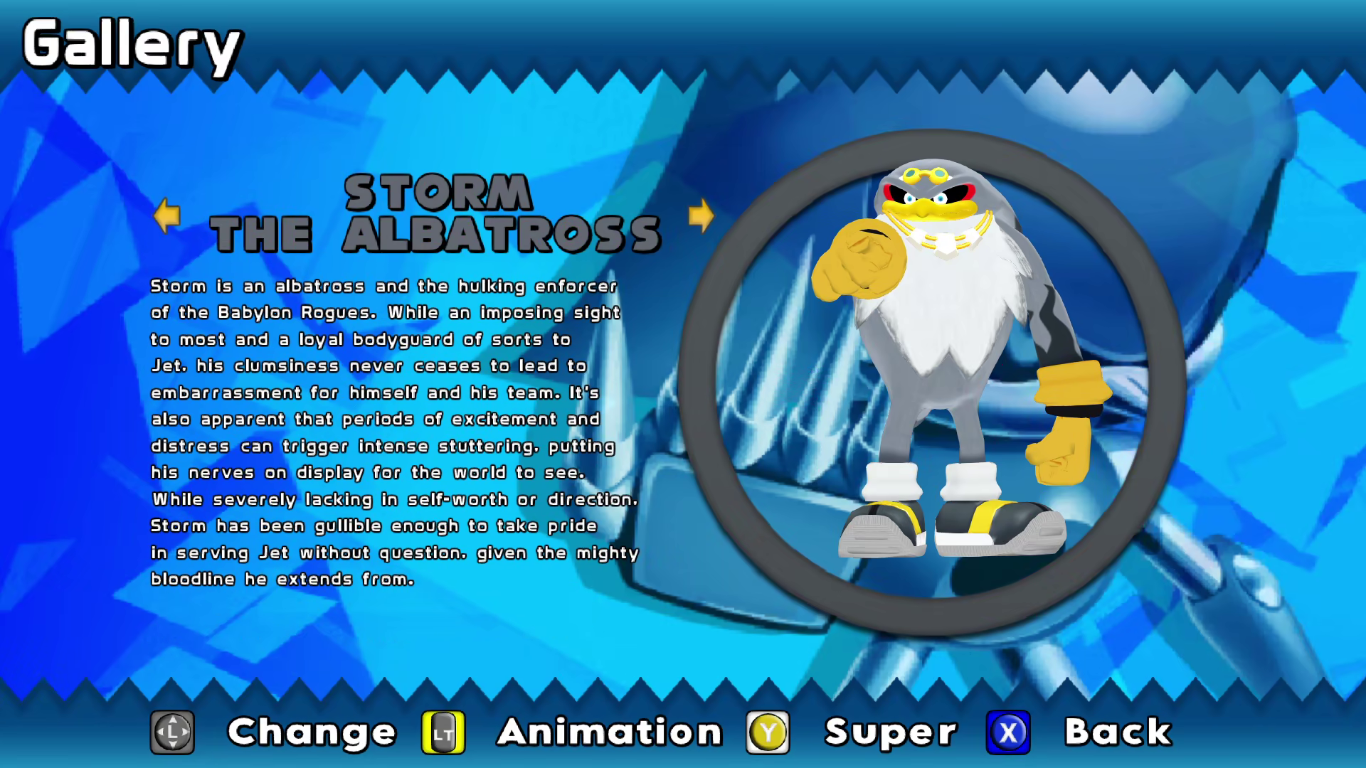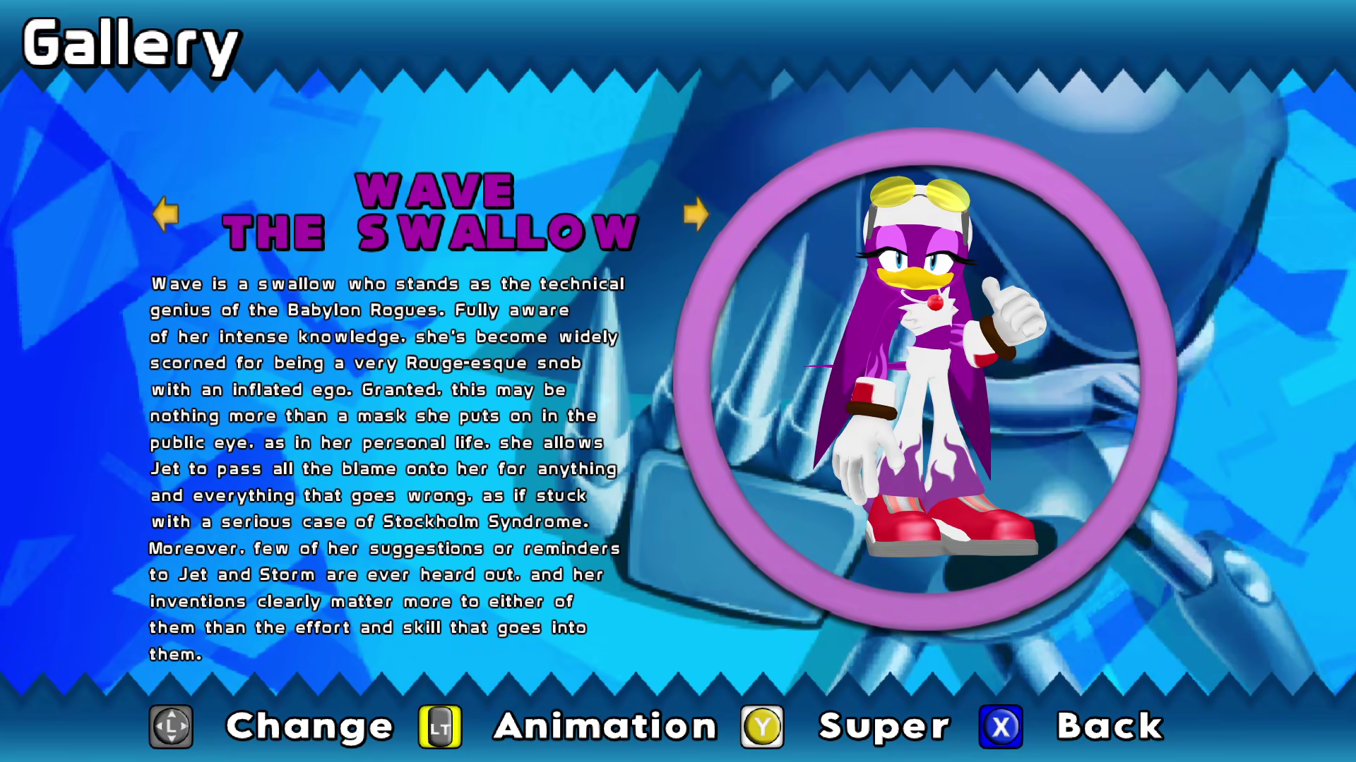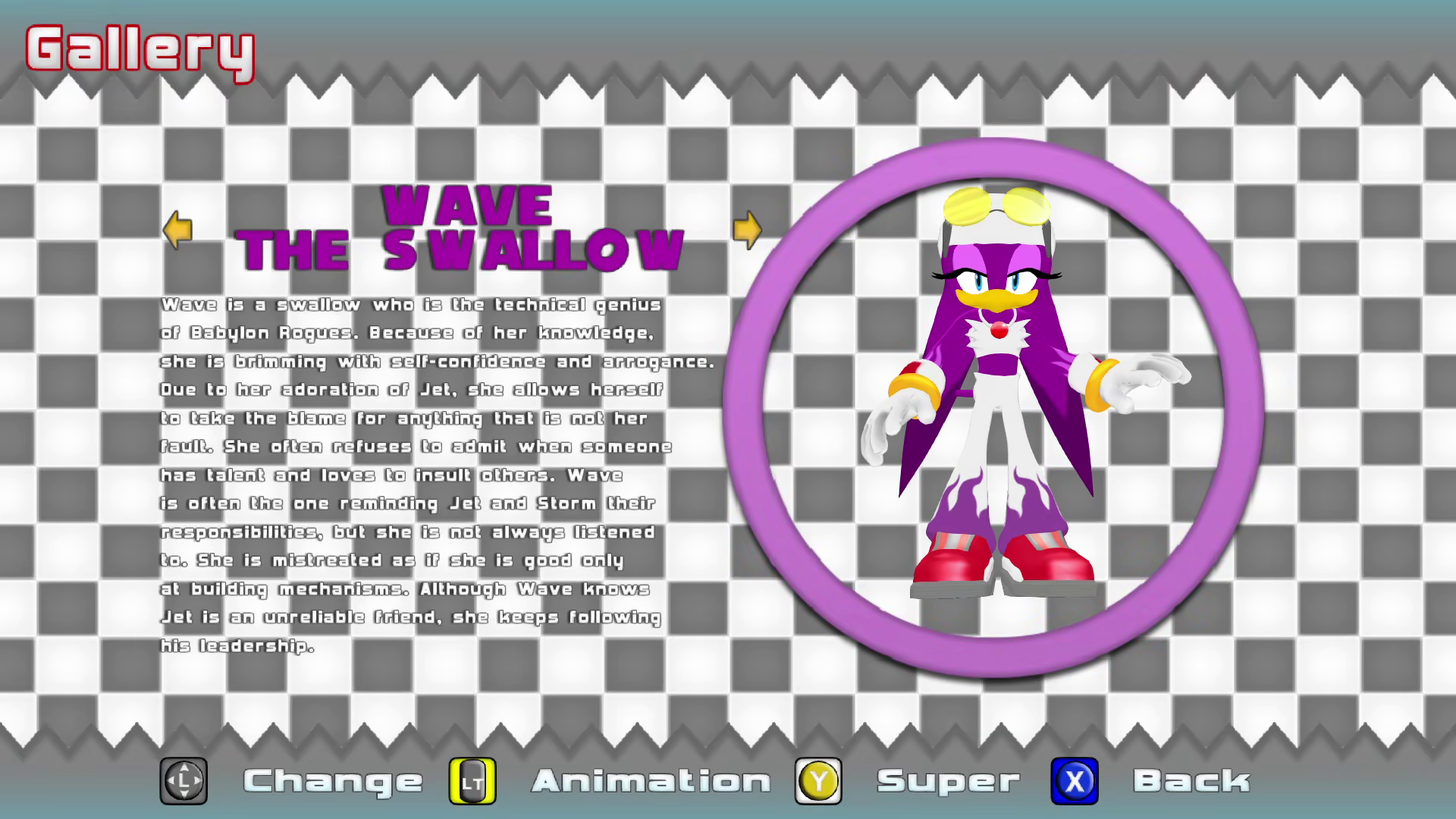 Clearly, though, as someone who’s in no way a fan of Sonic Riders beyond the premise and environmental design, the Babylon Rogues are where I have to falter, right? Well, here they are, all animated with X-Gear that only shows up when held, which is thanks to the process of adjusting the scale per every animation. See? Even their eyewear flips down! Get un-gravitified, morons!