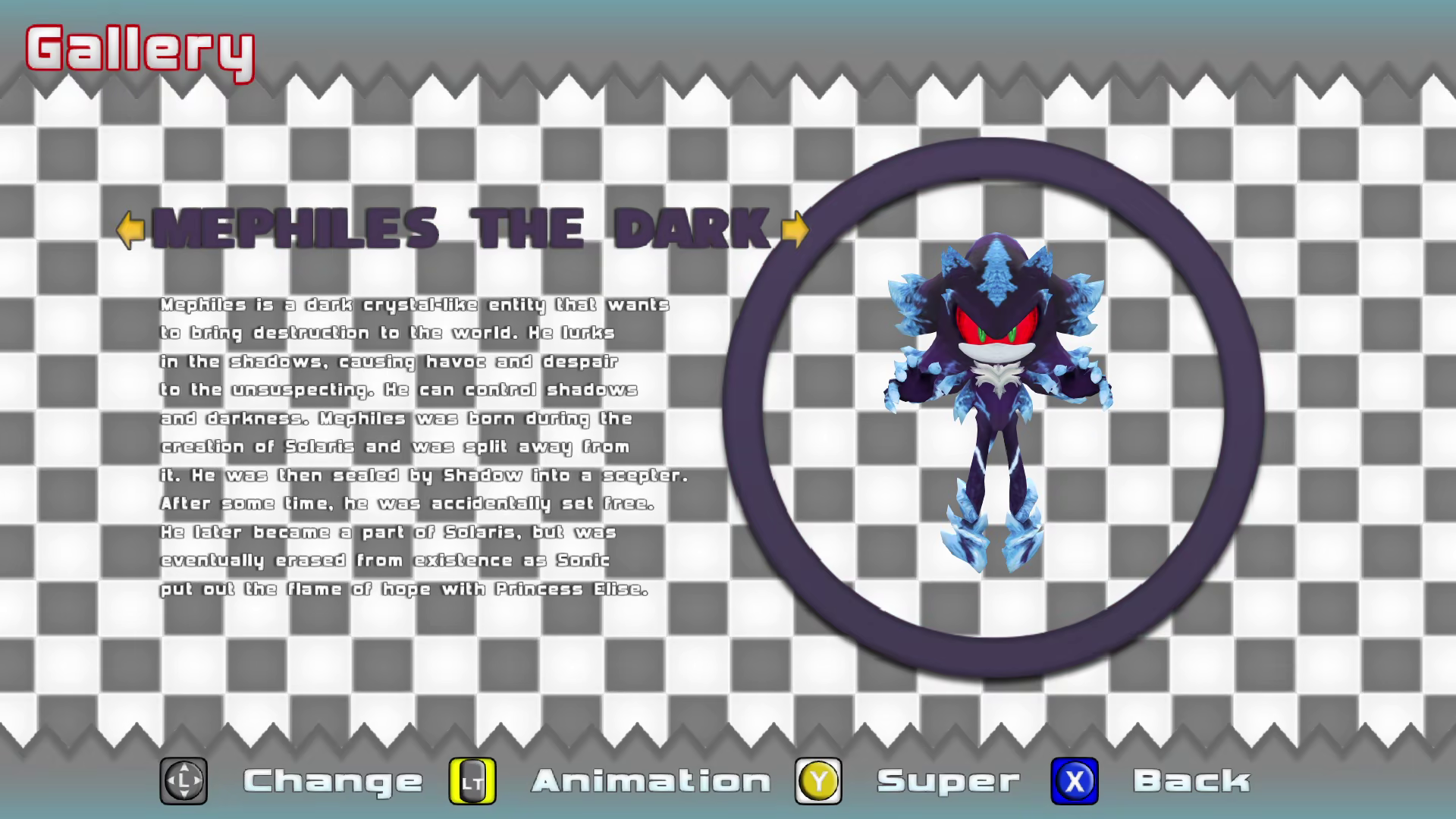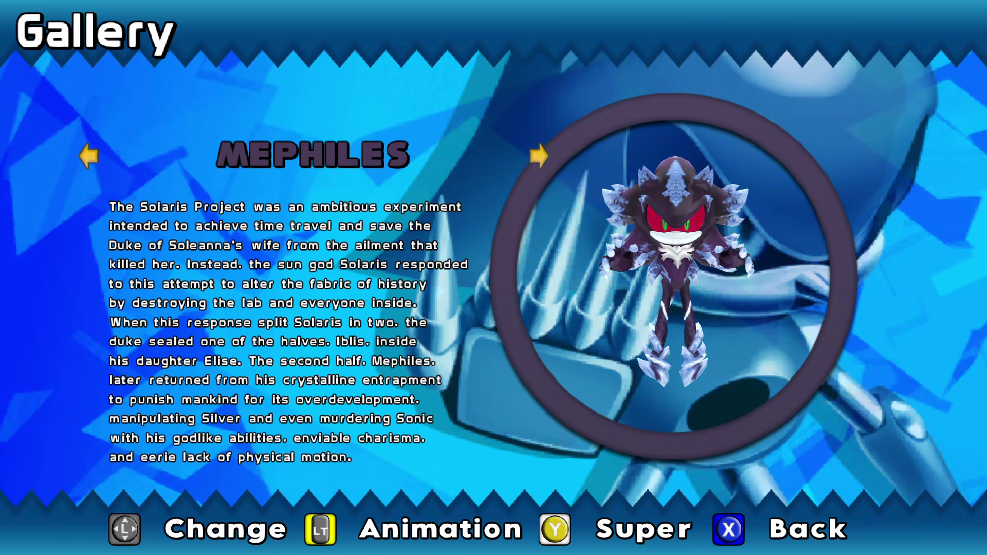 If you end up using this mod, you might notice that Mephiles is mostly motionless. This is because I find him scarier as a Weeping Angel-esque statue, as he’s written in Episode Solaris of The Recollected Cut to come off as charming and manipulative in spite of his lack of motion. Therefore, take a look at his “walking” animation and tell me there’s not something off-putting about him.