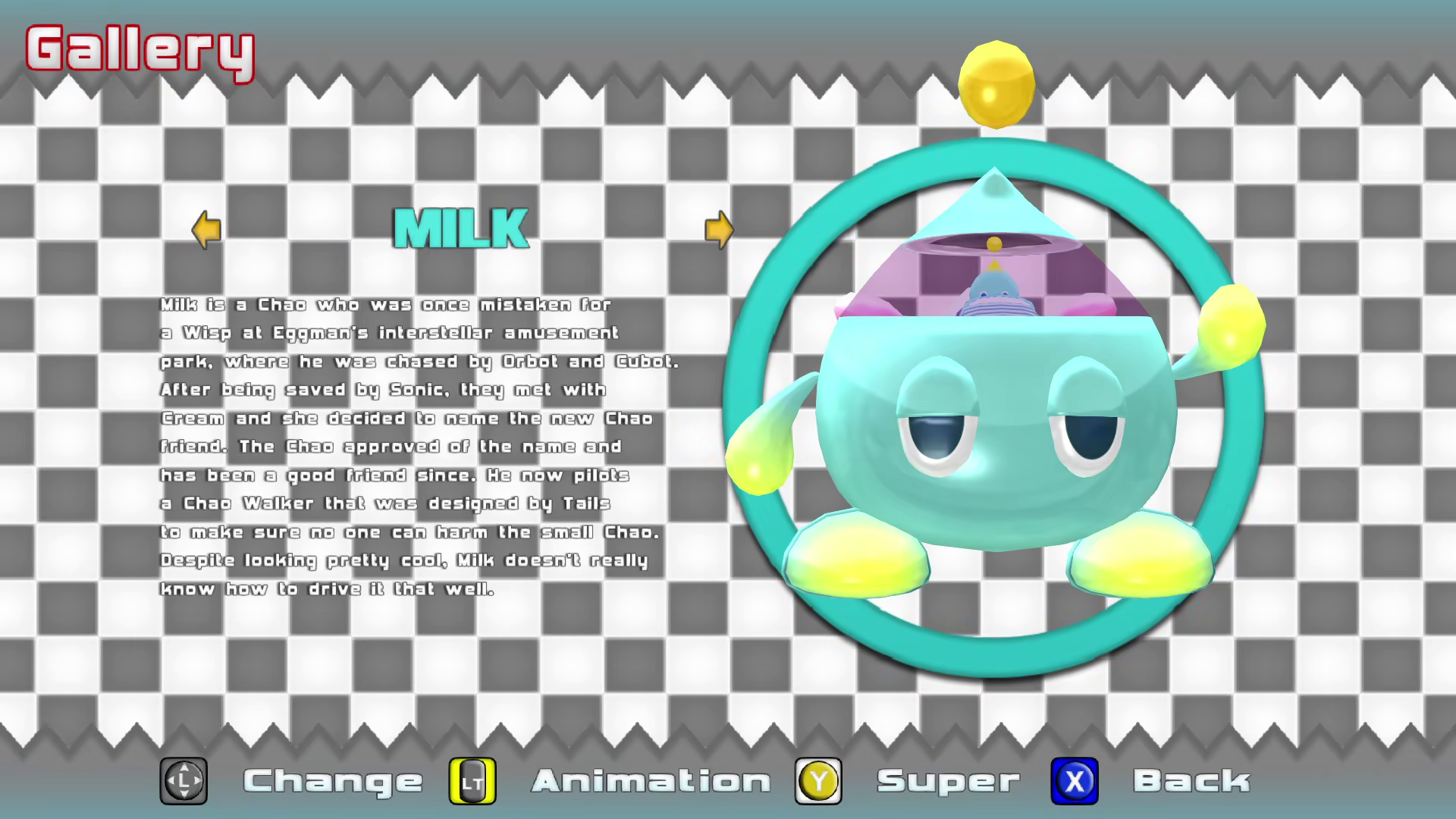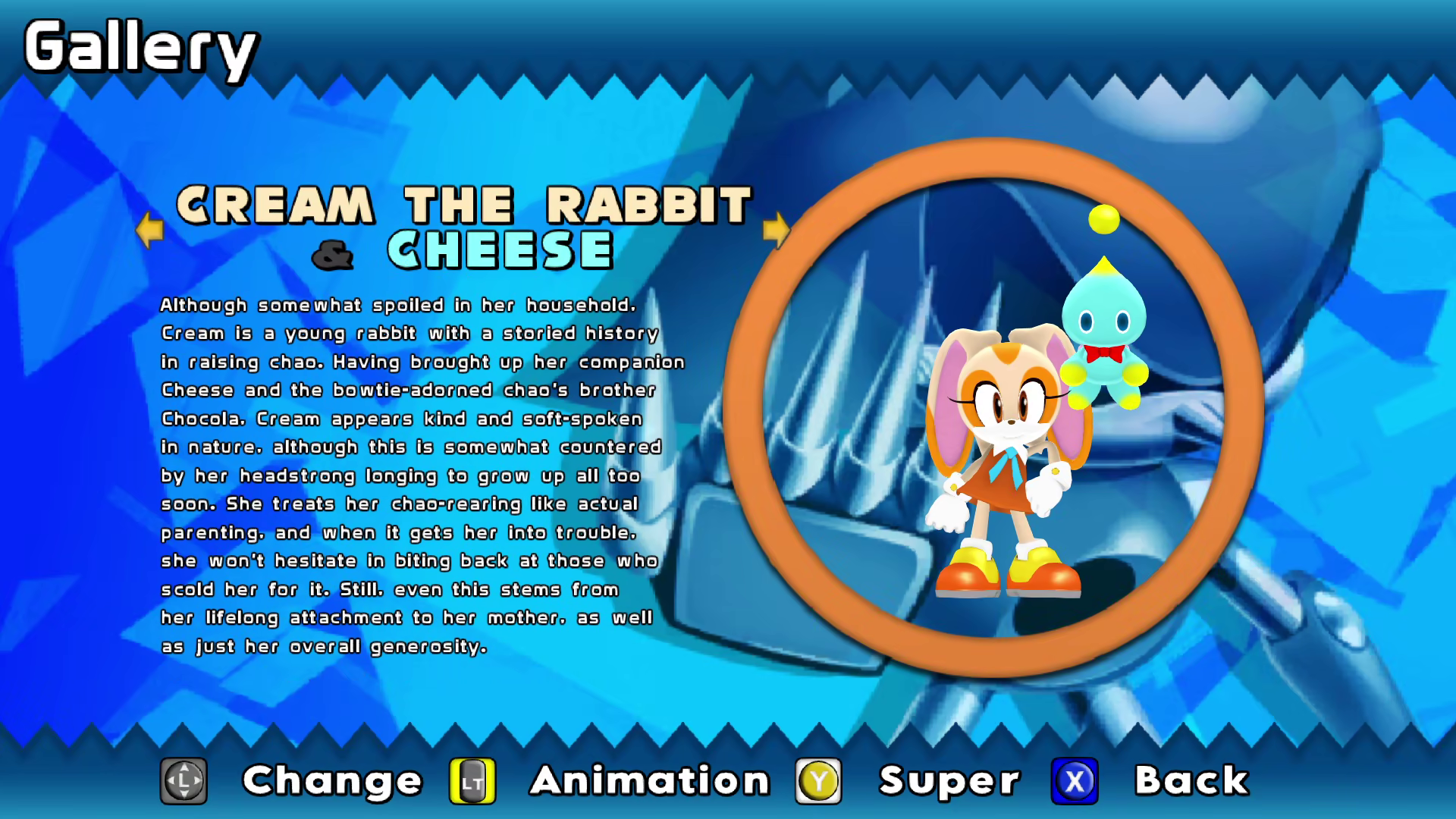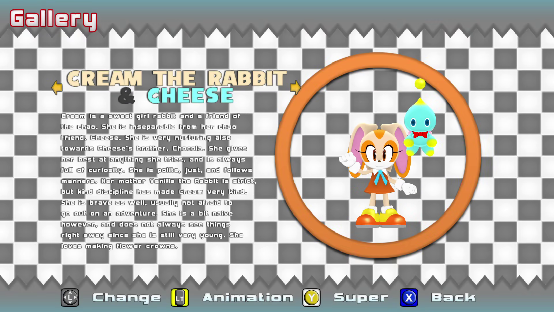 In this mod, all of the nonplayable gallery-only characters (Orbot, Cubot, Maria, Vanilla, and Eggman Nega) are made playable, and Vanilla is no exception! However, she uses Tails’s moveset so her and Cream won’t both be followed by Cheese when paired together, and she’s been entirely reanimated as Kojirakage’s original mod released for DX felt rushed. Her animations all look great, but really, this one’s all you have to see for now. Spin me right ’round, bunny. Right ’round. Right ’round like a record.